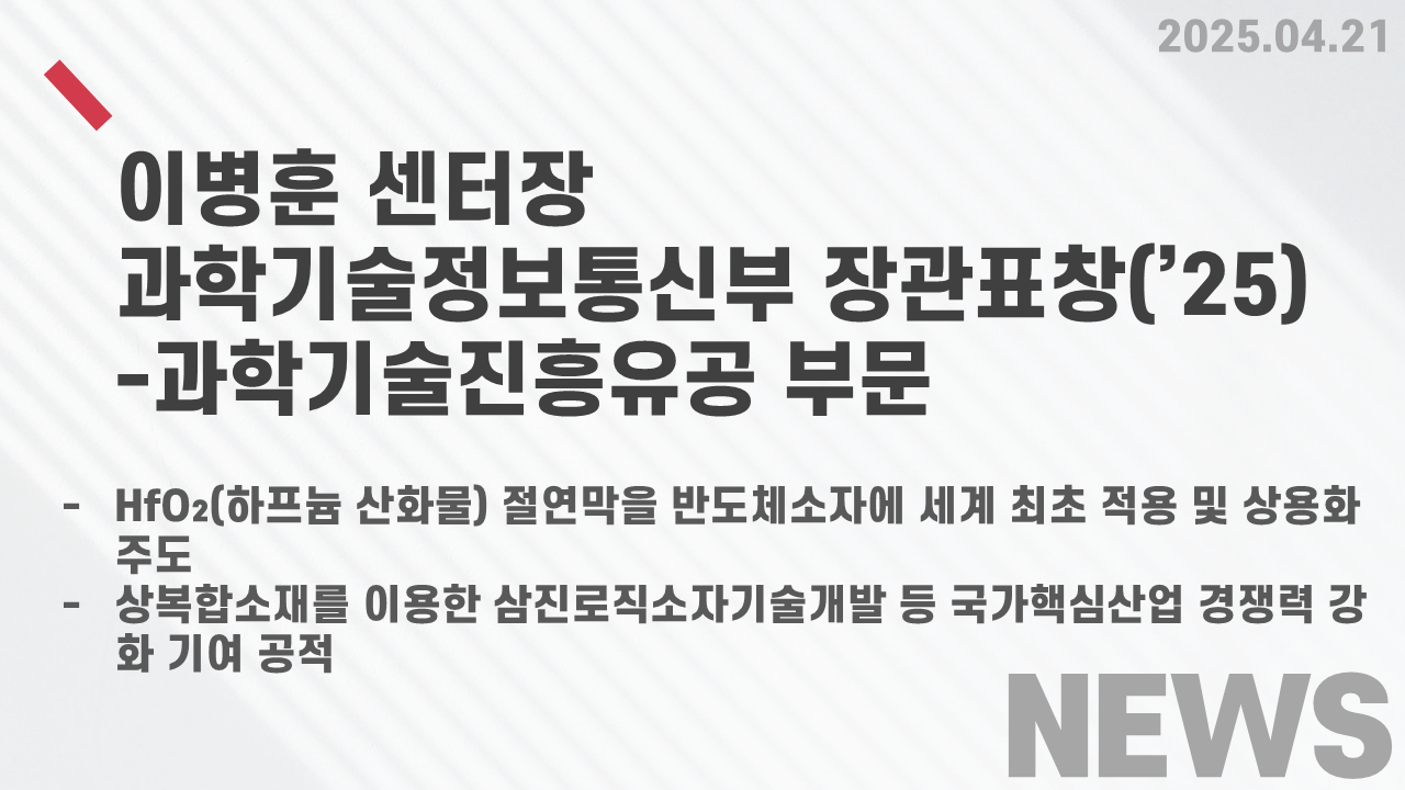 이밖에도 화학과 주태하 교수와 전자전기공학과·반도체공학과 이병훈 교수가 ‘과학기술진흥 유공’ 부문에서 과학기술정보통신부 장관표창을 각각 받았다.