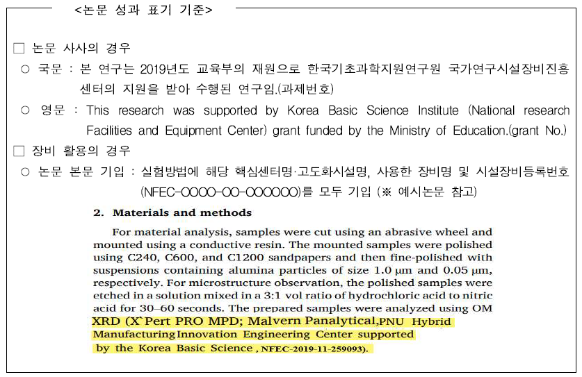 [논문 본문 기입] 실험방법에 해당 시설명, 사용한 장비명 및 시설장비등록번호(NFEC-0000-00-000000)를 모두 기입